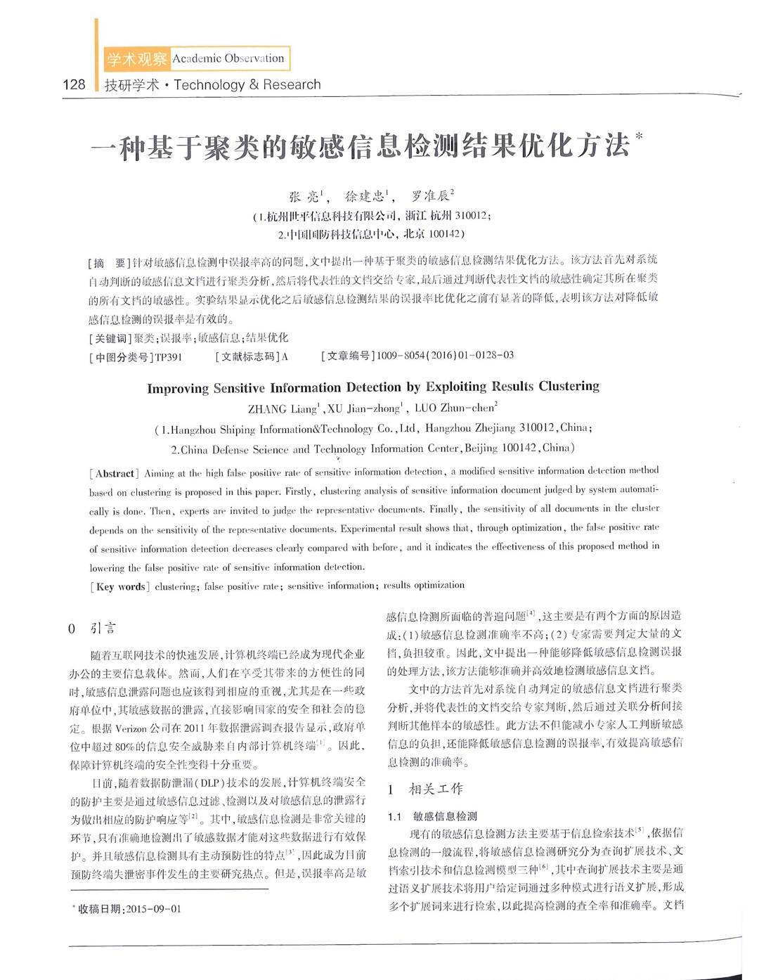 一种基于聚类的敏感信息检测结果优化方法—发表于《信息安全与通信保密》2016.1