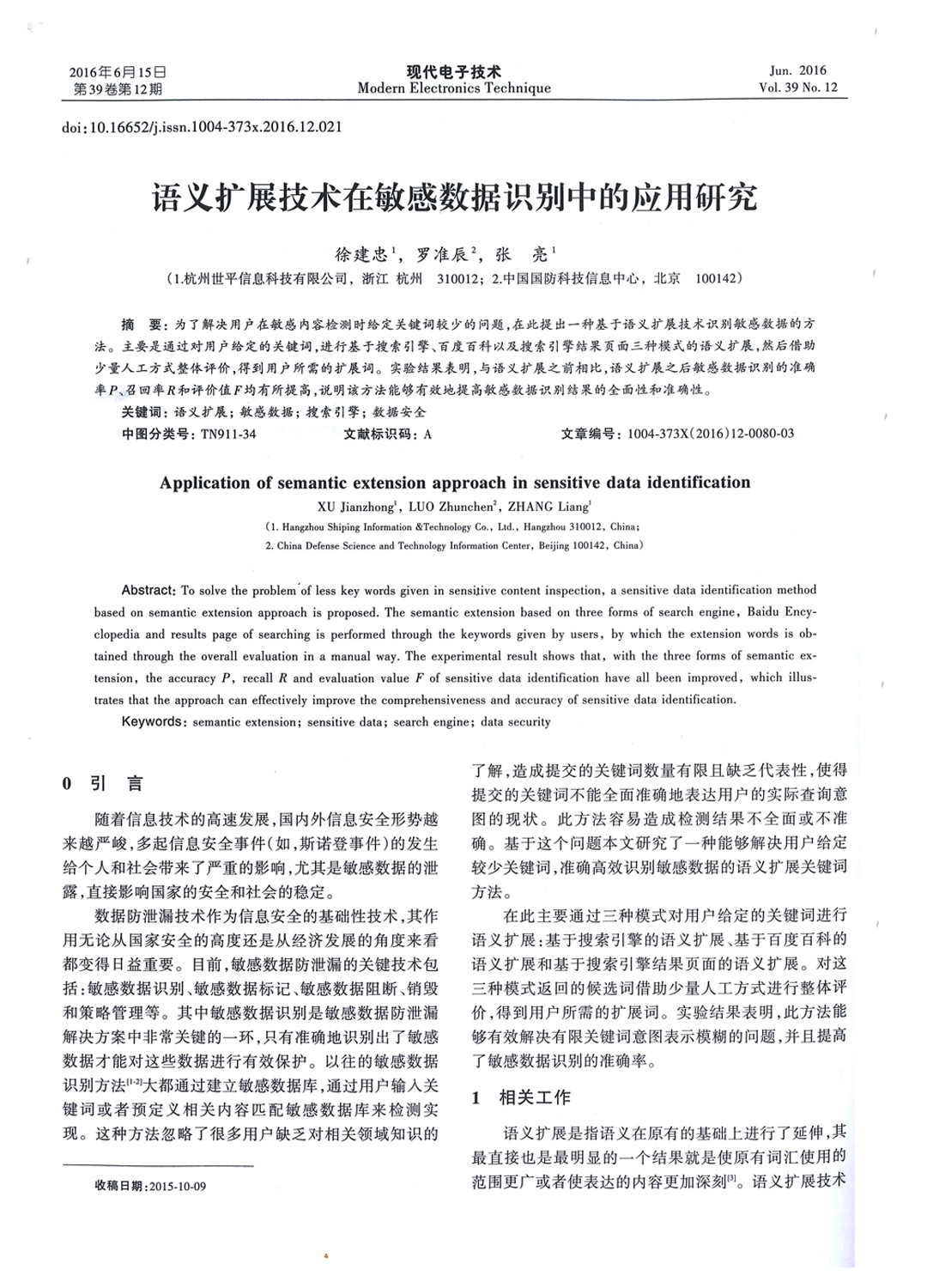 语义扩展技术在敏感数据识别中的应用研究—发表于《现代电子技术》2016.12
